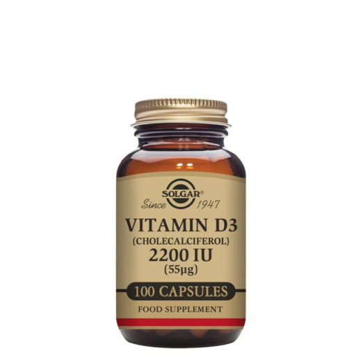 Solgar Vitamin D3 2200 IU (55 μg), 100 Vegetarian Capsules supports healthy bones and immune function.