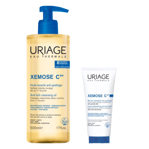 مجموعة Uriage Xémose C8+ هي مجموعة تحتوي على منتجين: 1 زيت تنظيف (500 مل) و1 بلسم غني مهدئ (50 مل) للبشرة الجافة إلى شديدة الجفاف والمعرضة للإصابة بالأتوبي.