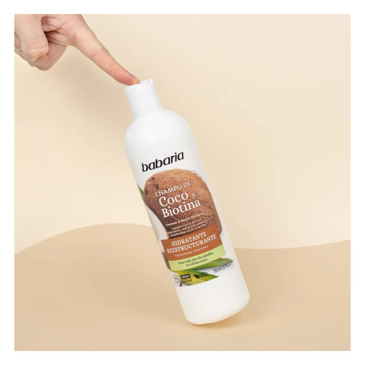 Babaria Coconut & Biotin Shampoo gently cleanses and strengthens the hair, leaving it nourished and shiny.