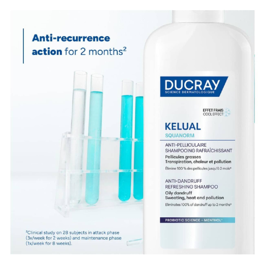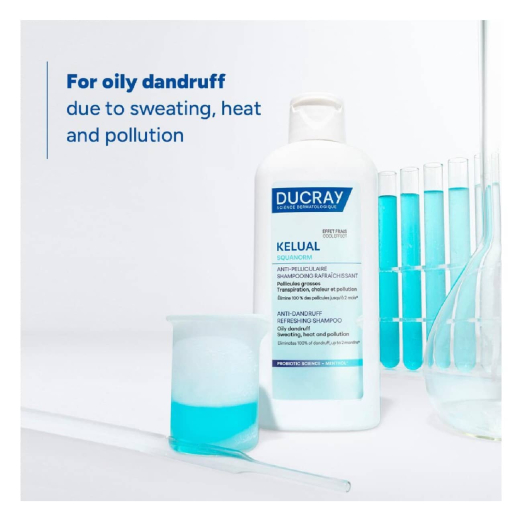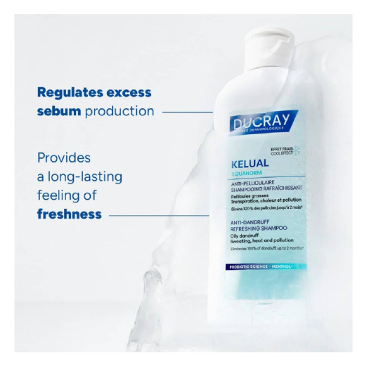 Ducray Kelual-Squanorm Anti-Dandruff Refresh Shampoo helps eliminate visible dandruff and regulate sebum production, leaving the hair clean and fresh while preventing its reappearance.
