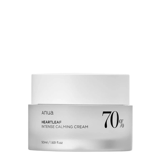 Anua Heartleaf 70 % Intense Calming Cream beruhigt und befeuchtet empfindliche Haut und reduziert Rötungen und Reizungen. Reich an natürlichen Inhaltsstoffen wie Jojobaöl und Sheabutter, die die Haut pflegen und geschmeidig machen.