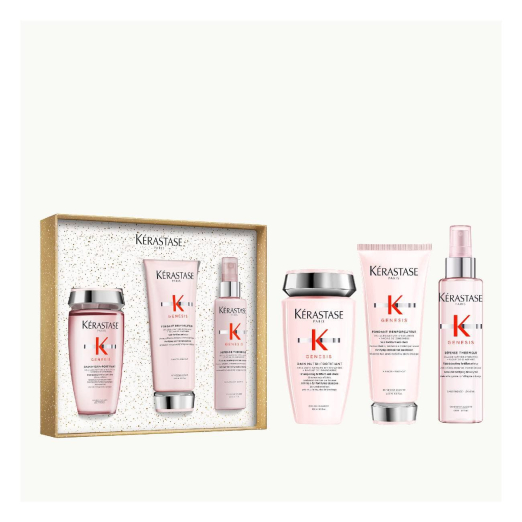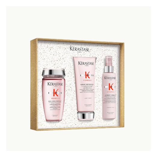 Das Kérastase Genesis Fondant Holiday Set ist ein limitiertes Trio, das entwickelt wurde, um geschwächtes, zu Haarbruch neigendes Haar zu stärken.