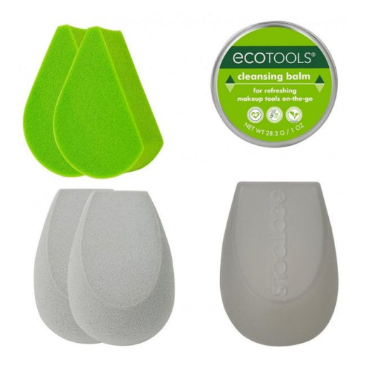 Ecotools Blending Essentials es un set que contiene: 2 cuñas triples, 2 esponjas de maquillaje, 1 bálsamo limpiador (28 g) y 1 caja de almacenamiento.