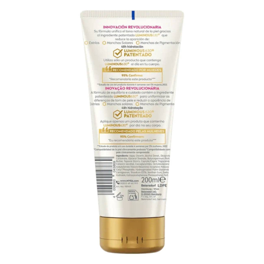 Nivea Luminous 630º Cream is a body cream suitable for all skin types that need deep hydration and correction of dark spots.