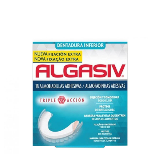 Algasiv Lower Denture Adhesive Cushions, 18 Units ensure secure and comfortable denture fixation.