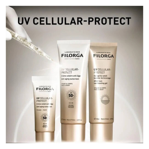 Filorga UV Cellular-Protect Face Sunscreen SPF50+ is a facial sunscreen that protects the skin from UVA/UVB rays, helps reduce wrinkles, dark spots, and loss of firmness, while hydrating and promoting a more even and radiant complexion.