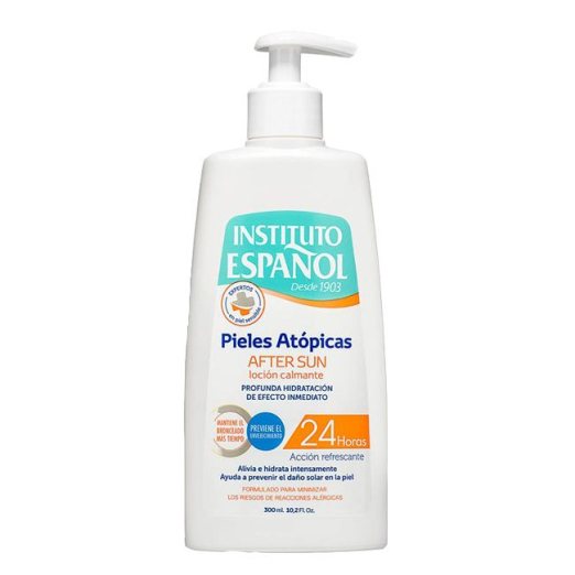 La loción calmante para después del sol para pieles atópicas del Instituto Españolayuda a la recuperación de la piel atópica después de la exposición al sol.