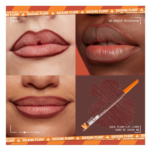 NYX Duck Plump Plumping Lip Liner is a longwear, retractable lip liner that defines, shapes, and visibly plumps the lips using spicy ginger and capsicum for a fuller-looking pout.