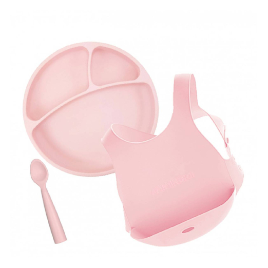 Feeding pack containing 1 plate with compartments, 1 bib, and 1 spoon