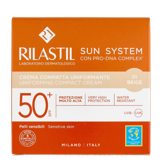 Rilastil Sun System Compact Foundation SPF50+ evens out skin tone and conceals imperfections, while protecting the skin from sunburn and erythema, keeping it healthy.