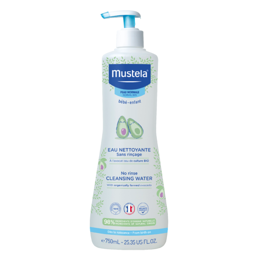 Mustela Cleansing Water protects and hydrates the baby’s delicate skin without the need to rinse.