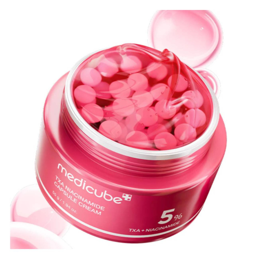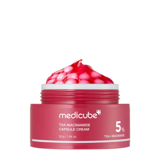 Medicube TXA Niacinamide Capsule Cream combines tranexamic acid and niacinamide for clearer, more even skin. It reduces dark spots, promotes a luminous, even complexion, and moisturizes the skin.
