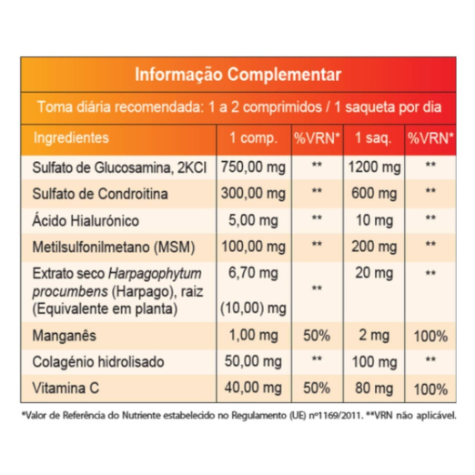- Main ingredients: glucosamine and chondroitin sulfate, Methylsulfonylmethane (MSM), hydrolyzed collagen, hyaluronic acid, vitamin C, manganese and Harpagophytum dry extract